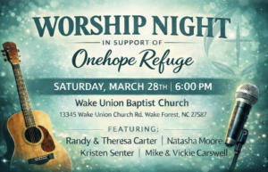 Wake Union Baptist Church is hosting a Worship Night on Saturday, March 28th at 6:00 PM in support of Onehope Refuge. Join us for a special evening as individuals and families share songs and musical pieces that reflect their love for the Lord, bringing our community together through music, worship, and a shared heart for the women and children we serve.